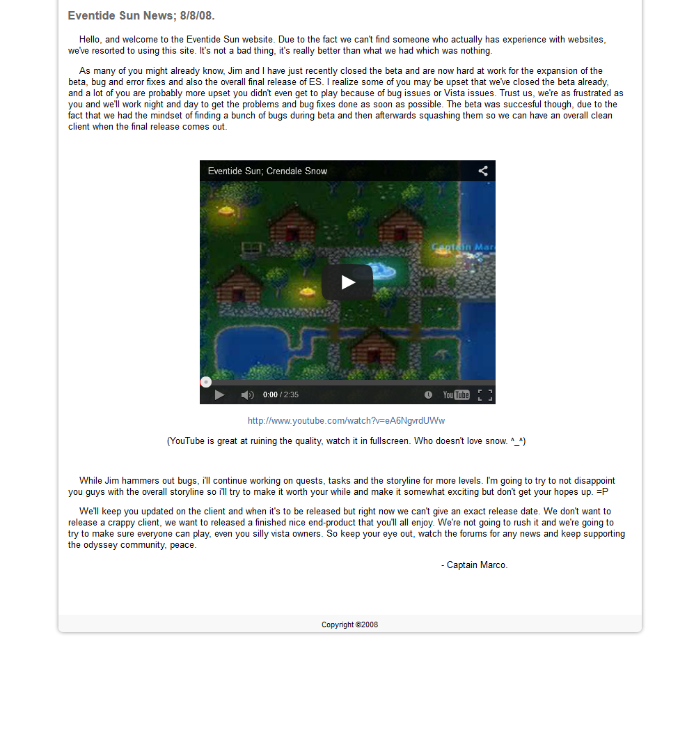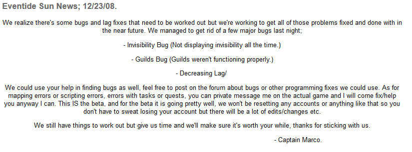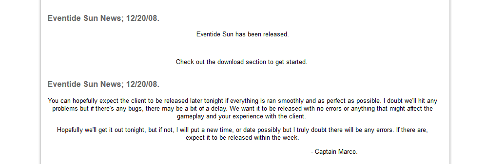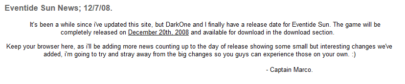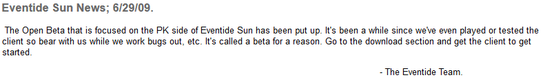 - The Eventide Sun website gets revamped, and a v3 beta is announced. The new client is written entitely in HTML5 which means it can be played in a modern browser.